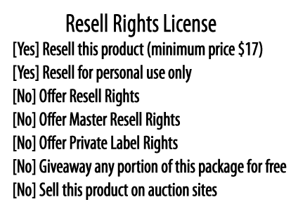 What's Included: Master Resell Rights to this package which allows you to resell it and keep ALL THE PROFITS!